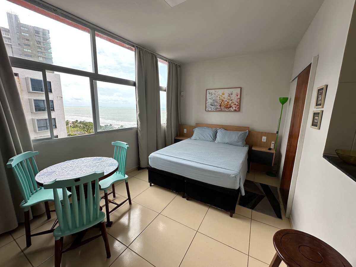 Studio med udsigt over havet, 15 minutter fra lufthavnen og det gamle Recife og Convention Center. Gammel og traditionel bygning på det mest populære og sikre sted på Boa Viagem Beach, med Seu Tito restaurant, Alphaiate bar og Borsoi café i stueetagen, 24-timers nærbutik og Assaí supermarked i nærheden. Ideel til praktiske og dynamiske mennesker, med en god intern struktur, køkken, wi-fi, queensize-seng, aircondition og et godt brusebad. Tredje gæst overnatter på en behagelig madras ved korte ophold.