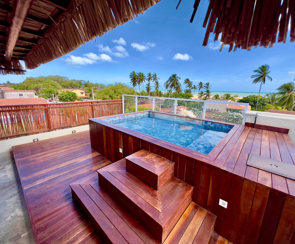 Et elegant og komfortabelt hus, fuldt klimatiseret, med balkon og terrasse i en lejlighed, der ligger lige ved stranden og med udsigt over havet og træerne i den nærliggende have. Terrassen har en privat jacuzzi og udsigt over den smukke solnedgang ved Maceió-stranden. Lejligheden er eksklusiv, med kun 4 huse og har et komplet fritidsområde med grill og swimmingpool.