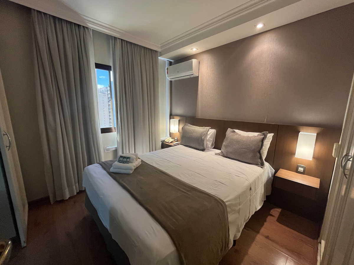 Privat lejlighed med indretning inspireret af London-charme, beliggende i et 4-stjernet hotel, der tilbyder komfort, funktionalitet og en god beliggenhed i São Paulo. Komplet og funktionelt miljø med hurtig wi-fi, aircondition, smart-tv, minibar og kaffekapsler. Bygningen har en swimmingpool, fitnesscenter og parkering i henhold til interne regler. Ideel til fritid eller arbejde med administration og support fra F&M Administradora de Flats under opholdet.