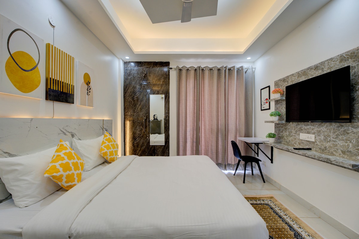 Velkommen til din stilfulde Executive 1BHK i hjertet af Phase 3, Gurugram – designet til forretningsrejsende, gæster på længerevarende ophold og alle, der nyder komfort med bekvemmelighed. Denne moderne lejlighed har et rummeligt opholdsområde, et fuldt udstyret køkken og et lyst soveværelse med førsteklasses sengetøj for at sikre et afslappende ophold. Træd ud på din private balkon, og nyd den fredelige udsigt, mens du drikker din morgenkaffe eller slapper af efter en lang arbejdsdag.