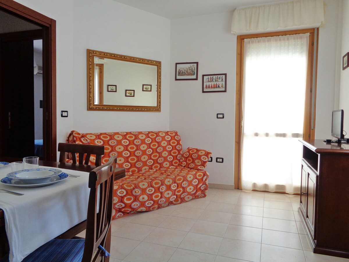 Dejlig uafhængig hyggelig lejlighed med gratis adgang til swimmingpoolen (SALTVAND, IKKE KLOR) næsten med havvand!!! Komplet med alt ... dobbeltseng, rummeligt badeværelse, satellit LED-tv, aircondition, varme, køkkenkrog, klassisk ovn, mikrobølgeovn, køleskab, vaskemaskine og parkering Ideel til lidt afslapning, fred og ro om natten! Den rummer nemt 2 personer, og en tredje, hvis det er et barn i en VUGGE! 30 kvm plus overdækket veranda!