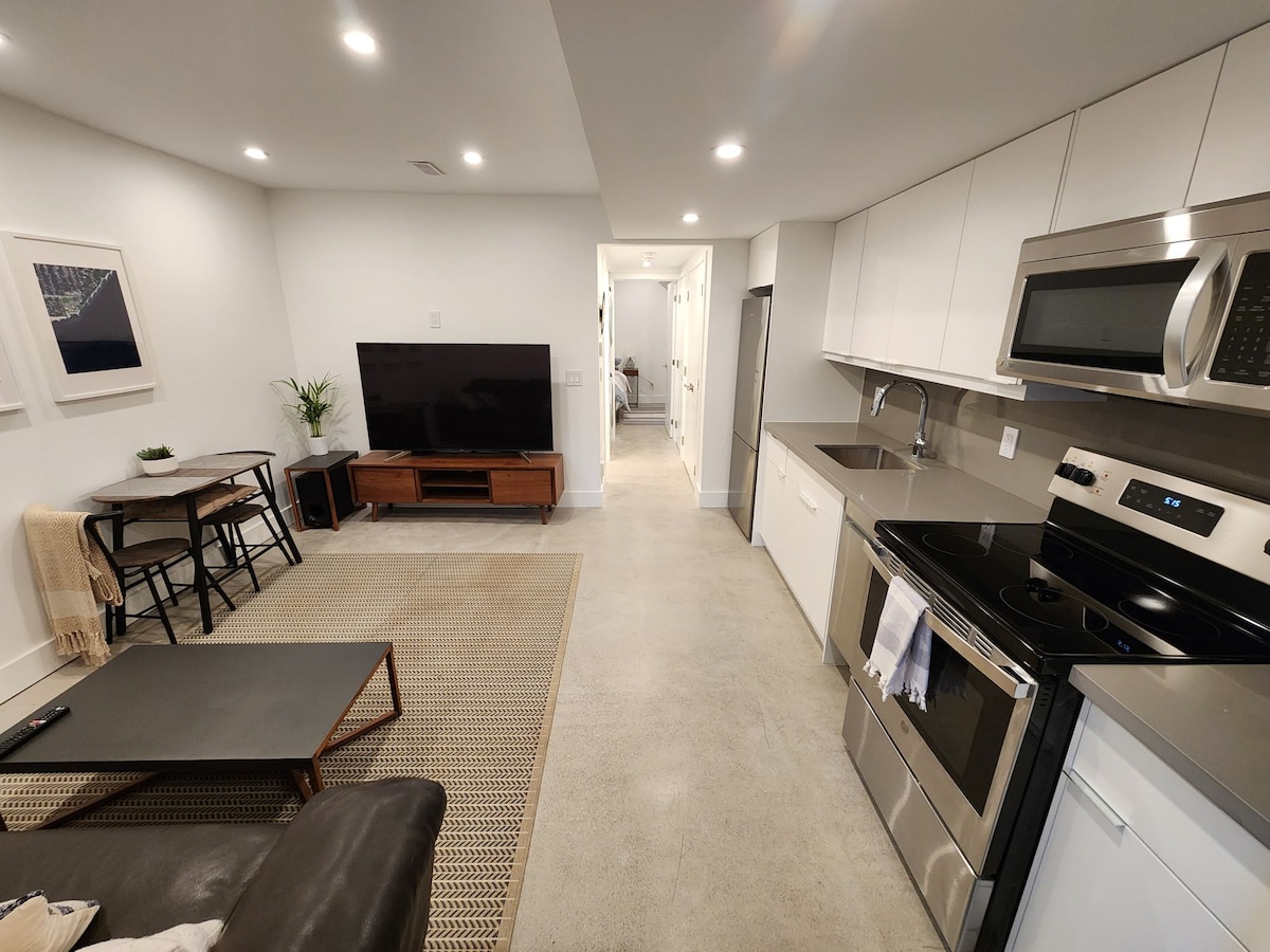 Træd ind i stil og komfort i dette gennemtænkte hjem, hvor canadisk avantgarde-kunst møder tidløse antikviteter og moderne faciliteter. Nyd et roligt soveværelse med en blød queensize-seng, to luksuriøse fjerfyldte sofaer, et køkken, der er klar til kokke, et overdimensioneret designer spisebord i natursten, kontorplads, zen-badeværelse, komplet vaskeri, en solbeskinnet terrasse og en frodig baggårdsoase. Ideel til raffinerede byferier eller afslappende ophold. Privat parkering er inkluderet for at gøre det nemmere for dig.