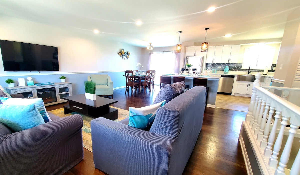 Oplev et moderne og roligt tilflugtssted i vores store bolig med 4 soveværelser og 2,5 badeværelser. Perfekt blanding af komfort og bekvemmelighed. Plads til 9 personer. Master-suite. Soveværelser: 3 kingsize-senge og to dobbeltsenge. 6 Smart TV'er. Åben planløsning med fuldt udstyret køkken, hvor du kan lave mad og skabe oplevelser med familien. Stor indhegnet baghave med en stor terrasse. Parkering 3 biler. Tæt på restauranter, shopping, stier og parker. 10 miles til Schaumburg Convention Center, 27 miles til O'Hare Airport, 8 miles til Woodfield Mall