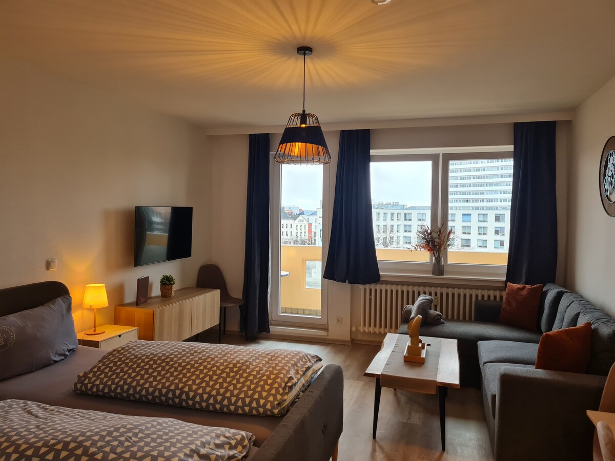 Stilfuld lejlighed i et skandinavisk look i hjertet af Bremen. Altan, fuldt udstyret køkken, WiFi, Smart TV, vaskemaskine. Perfekt til 2–4 gæster. Top beliggenhed på markedspladsen, 500 m til hovedbanegården, gåafstand til havn, zoologisk have, klimahus og strand. Familievenlig med høj stol og rejseseng. Privat parkering. Ideel til udflugter til Helgoland, Sylt, Bremen og omgivelserne.