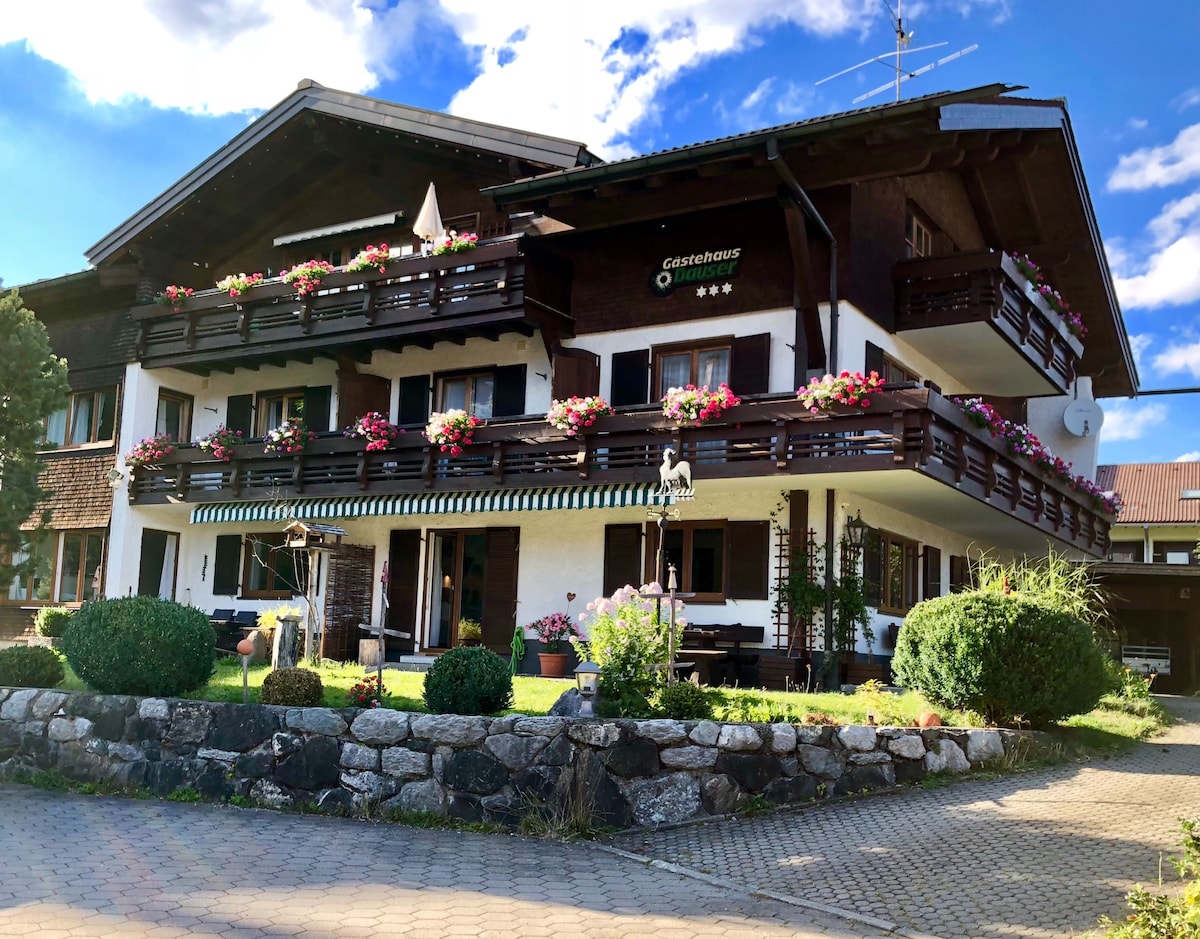 Et stilfuldt, moderne værelse med dobbeltseng og brusebad/wc - værelse i alpin stil med tv og hurtig WiFi. Fluffy håndklæder, power hårtørrer, socialt toiletpapir & sæbe fra Allgäuer Werkstätten.