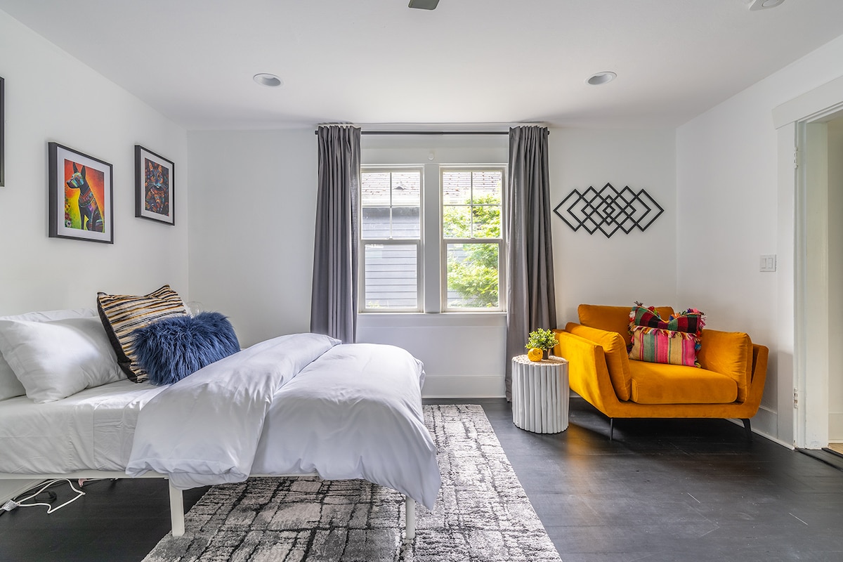 Dette stilfulde havestudie ligger centralt i Madison Valley tæt på Lake Washington, Capitol Hill, Madison Park, Madrona og downtown Seattle. Den har en hyggelig queensize-seng, et fantastisk brusebad, et kontorloft og et lille moderne tekøkken, der har en kogeplade og køkkengrej, hvis du vælger at spise der. Vidunderlige bagerier, restauranter, kurbade, små detailbutikker og arboretummet ligger et par gåblokke væk. Vi er LGBTQ+-venlige og byder alle velkommen!