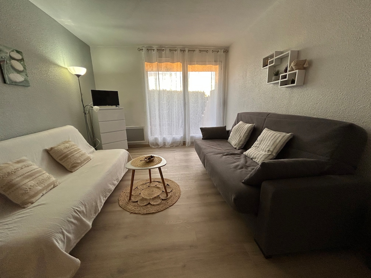 Fuldt renoveret lejlighed i stueetagen. Boligen har udsigt over agreou-stranden. Fuldt udstyret køkken, selv opvaskemaskine. Badeværelse i beton og akacie. Soveværelsesalkov i flydende træ. Sengepladser 4 med klik i loungen. Lejligheden har en dejlig terrasse og en stor stue med parkeringsplads og 2 cykler. Tæt på alle penons faciliteter. Meget godt placeret og nem at få fat på.