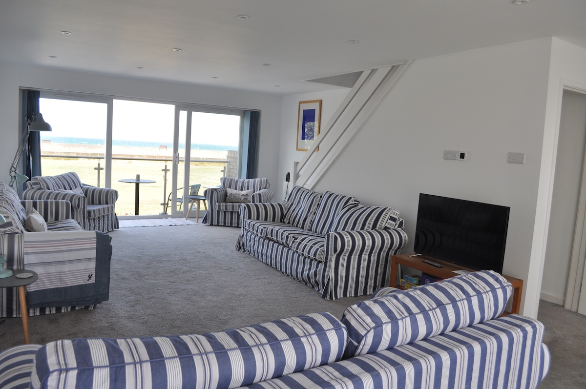 Et lyst rummeligt strandhus på tre etager med havudsigt. To minutter fra strandpromenaden. Mellemetagen har en stor dobbeltværelse (sovesofa her) med to altaner, der vender mod øst og vest. Stueetagen har et stort køkken, der fører til en sikker asfalteret/hævet have gennem dobbeltdøre, en garderobe og et soveværelse med eget badeværelse. Den øverste etage har yderligere to soveværelser og et familiebad. Ideel til afslappede sammenkomster med familie og venner. Et behageligt hjem væk hjemmefra.