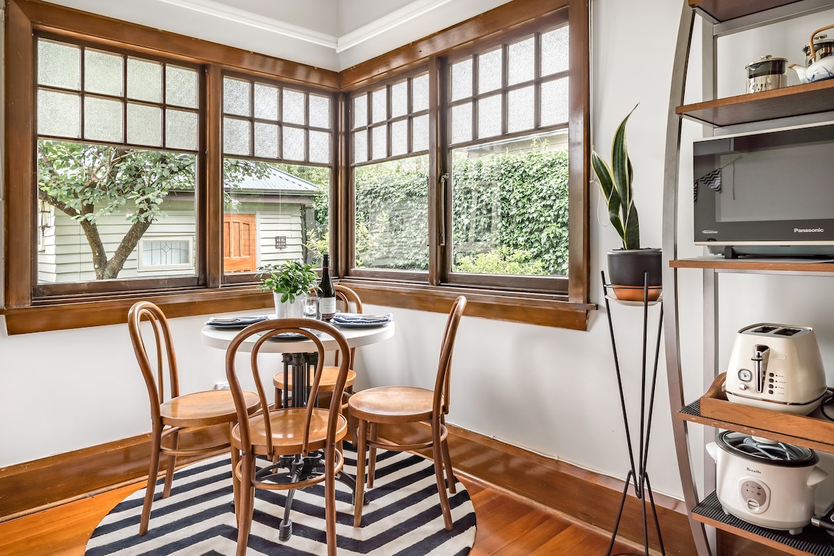 Velkommen til vores charmerende hjem fra 1930'erne tæt på CBD (10 minutter i bil). Træd ind i en verden af vintage elegance og moderne komfort i vores boutique-Airbnb. Denne perle med to soveværelser kan prale af originale træpaneler og gulvdetaljer fra 1930'erne, kombineret med moderne faciliteter, der giver et helt unikt ophold. Hvert soveværelse er designet med din komfort i tankerne og er udsmykket med luksuriøst sengetøj, der lover en afslappende nats søvn efter en dag med at udforske seværdighederne og lydene i vores pulserende by.