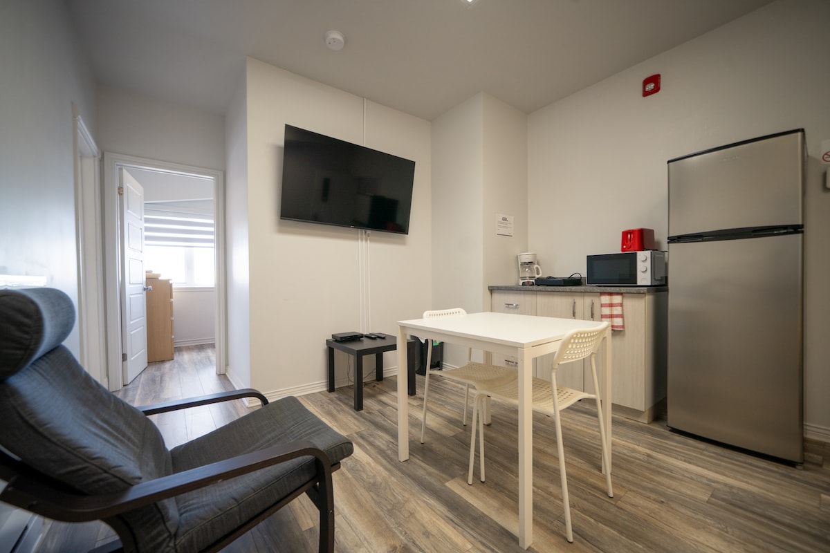 Bienvenue dans notre suite urbaine moderne et confortable. Parfaite pour un séjour en couple, en solo ou pour un déplacement professionnel, cette suite combine design, praticité et tranquillité. Lit double confortable; kitchenette équipée (micro-ondes, plaque, cafetière, etc.) literie, vaisselle. La salle de bain et douche sont partagées avec d’autres locataire; •Wifi, câble, TV intelligente; •Non-fumeur •Les animaux ne sont pas acceptés.