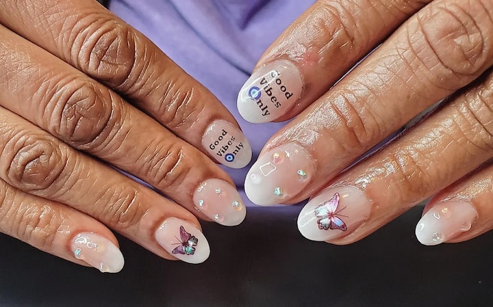 En tør manicure, der omfatter pleje af neglebånd, forberedelse af negle, gelpolish og neglekunst.