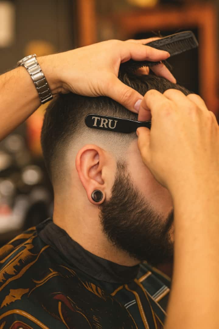 Størrelsen på det formede og formklippede skæg er lavet efter gamle teknikker med brug af shavette. Sessionen slutter med en oliebehandling og påføring af varme håndklæder og damp fra Vapozone.