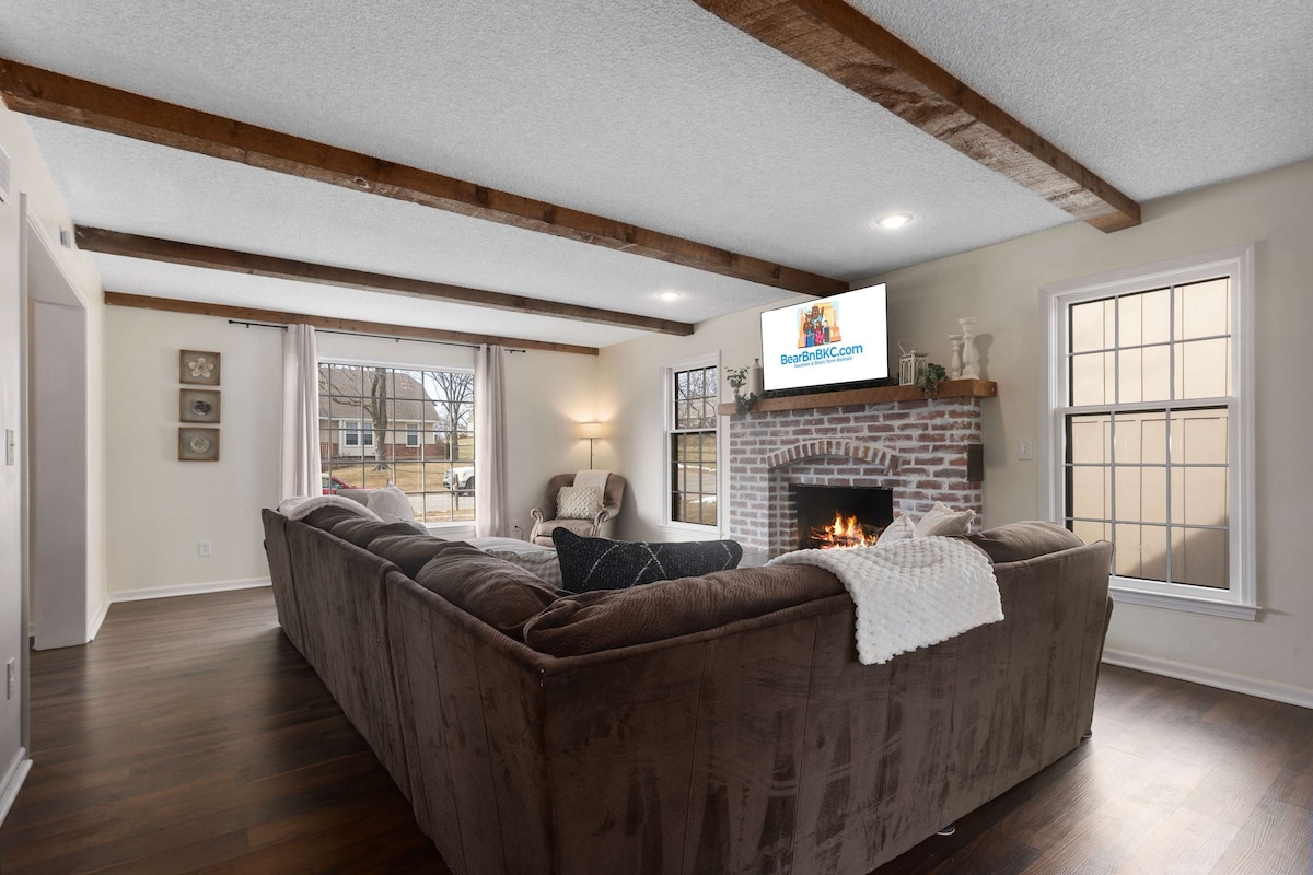 2 NYE kingsize-senge, 1 queensize-seng, gulvtæppe, Roku-tv i alle senge og familierum. Nyrenoveret bad og køkken! 3 soveværelser mere ved siden af! God til bryllupsgæster eller grupper, der ønsker at bo i nærheden af hinanden. Beliggende i et dejligt roligt nabolag! Hwy i nærheden af alt KS/MO. Køkkenet er veludstyret. Nyd terrassen med en aftencocktail. Der opkræves et dagligt adgangsgebyr på over 50 hektar med fantastiske vandrestier og pool i sommermånederne. Babyartikler til rådighed.