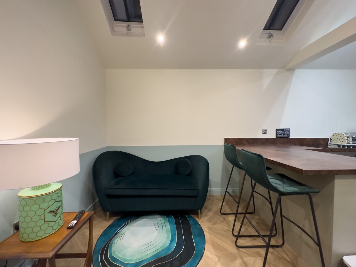 The accommodation was once a barn dating back to 1900. It is a contemporary conversion within the rear garden of the main house. The property incorporates everything needed for a great stay. It is completely private and self-contained. The ground floor consists of an open plan living room/kitchen and is accessed by two large patio doors. A staircase leads to a light and airy bedroom with a king size bed, drawers and a wardrobe. There is an en-suite bathroom with walk-in shower.