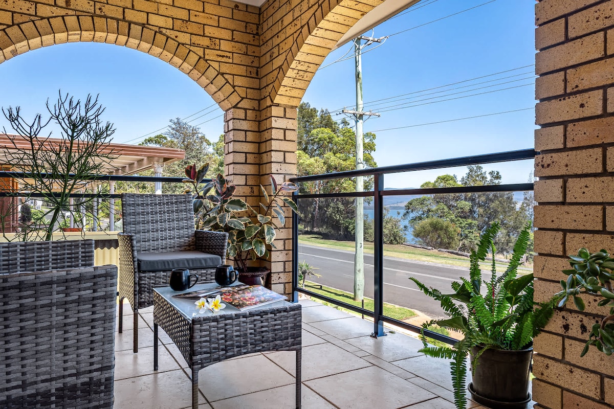 Direkte overfor Lake Illawarra med fantastisk udsigt over søen og bjergene fra stuen, spisestuen og køkkenet. Gå ud på den nederste balkon foran til middag eller morgenmad, eller nyd blot udsigten og solnedgangen. Slap af i den private baghave med tropisk tema. Parkering uden for gaden. Fuldt udstyret køkken og mulighed for tøjvask. Spadser 300,0 m til anløbsbroen for fiskeri eller legeplads. Perfekt beliggenhed med en fantastisk udsigt til at udforske Shellharbour-regionen.
