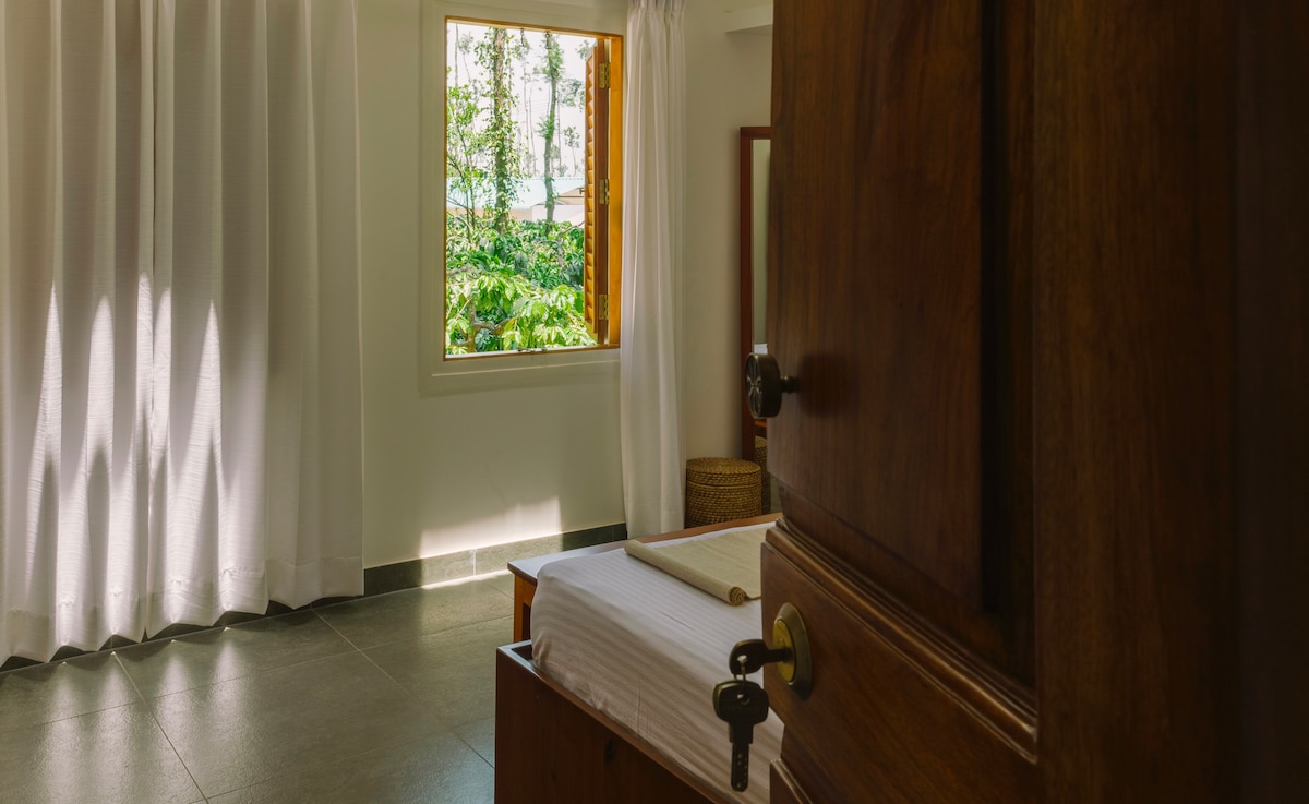 Flygt ud i naturen i vores luksuriøse private villa, der ligger i hjertet af en frodig grøn kaffeplantage nær Mudigere, Chikkamagaluru. Dette fredelige tilflugtssted er omgivet af rolige plantager og naturskønne bakker og tilbyder den perfekte blanding af komfort, privatliv og naturlig skønhed • Rummelig og smukt designet privat villa midt i kaffeplantager • Privat swimmingpool til en forfriskende dukkert • Bålplads til hyggelige aftener under stjernerne • Hjemmelavet mad fås mod et tillægsgebyr🌿