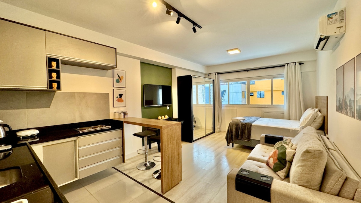 Studio moderno, no Centro Cívico — ideal para quem busca conforto, praticidade e excelente localização em Ctba. Ambiente climatizado, cozinha equipada e Smart TV — perfeito para lazer ou trabalho. 🛏️ Acomoda com conforto até 4 pessoas, roupa de cama de qualidade. • Piscina aquecida • Academia • Sauna • Terraço • Lavanderia (paga) ⚠️ Para uso da piscina o condomínio exige apresentação de atestado. 🚗 Estacionamento disponível no prédio, valor R$ 35 por diária Pago via PIX ao anfitrião.