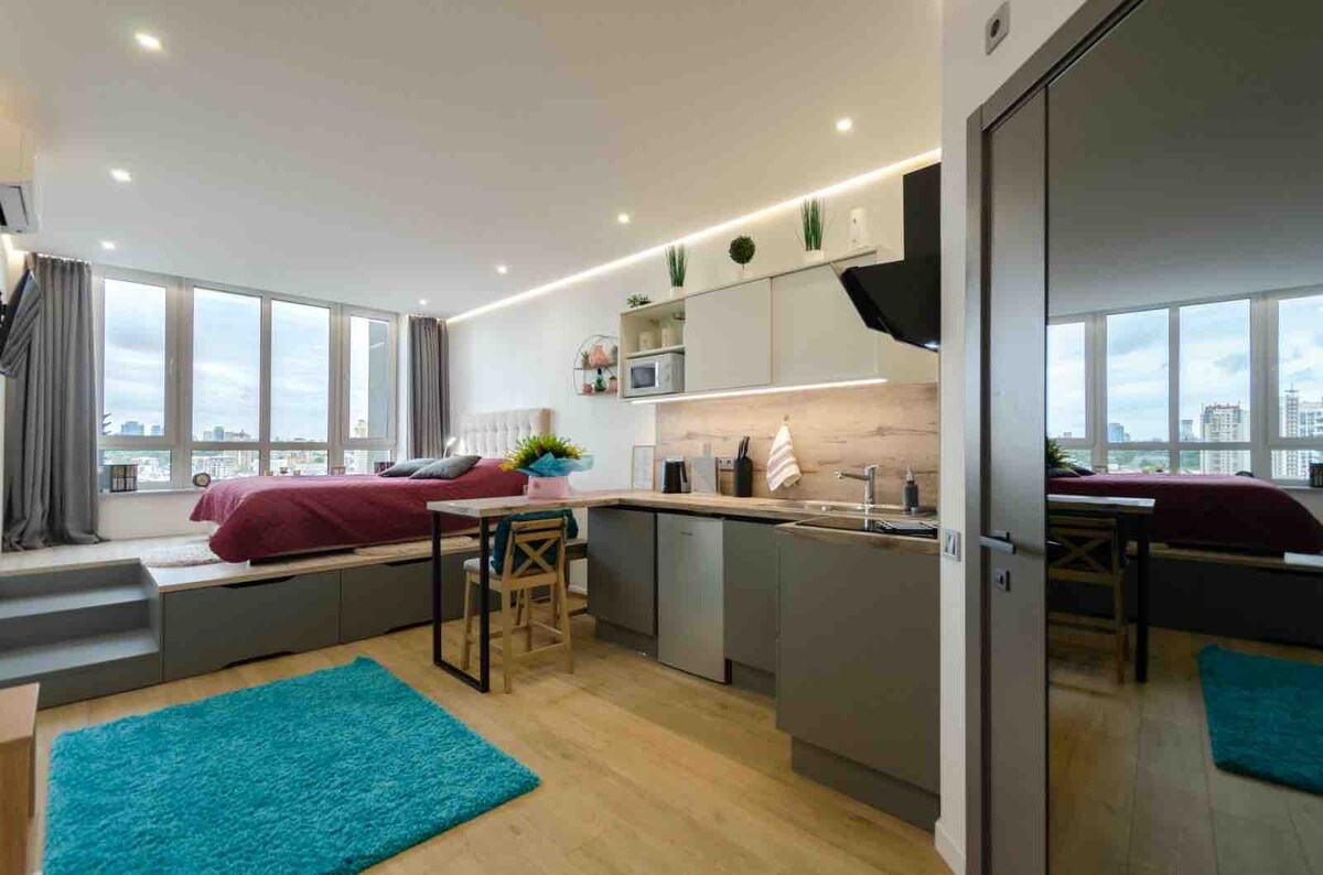 En ny smart studiolejlighed ligger i et smukt nyt moderne beboelseskompleks tæt på byens centrum. Lejligheden har BACKUP-STRØM fra vekselretteren og batterisystemet, hvilket sikrer, at du har elektricitet selv under strømafbrydelser. Nyd uafbrudt komfort og bekvemmelighed! Vi har parkering mod et ekstra gebyr. Tjek ledighed. "Bartscher" -rengøringsmaskiner er installeret i de vigtigste lobbyer for nemheds skyld i al slags vejr.