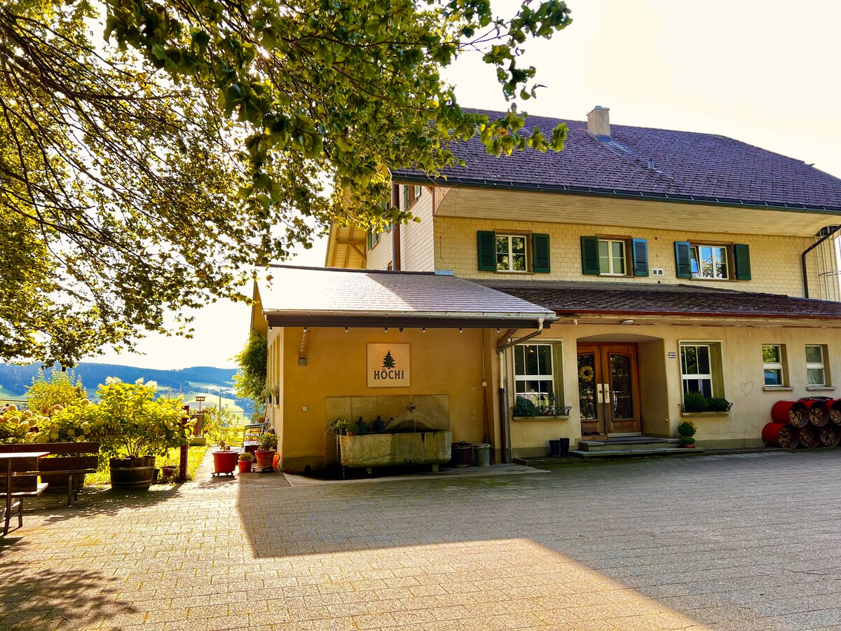 Die gemütliche und stilvoll eingerichtete Wohnung ist im 2. Stock unseres 100jährigen ehemaligen Schulhauses. Das Haus steht auf den Hügeln des Emmentals in voralpinem Gebiet auf rund 1000 M.ü.M. Wer Ruhe sucht, Tiere und Natur mag, ist bei uns richtig. Ein wunderschöner Wald befindet sich gleich hinter dem Haus und vom Balkon aus hat man eine fantastische Aussicht vom Jura bis zu den Berner Alpen. Wanderwege und Bikerouten sind direkt vor der Haustüre.