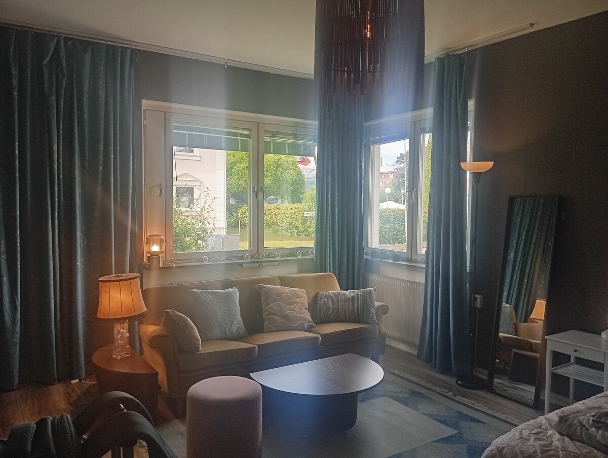 4 gæster. Nyrenoveret toværelseslejlighed, 60 kvm med komplet køkken. Lejligheden ligger i en bygning fra århundredeskiftet i nederste etage. Egen indgang. Køkken med komfur, ovn, mikrobølgeovn, køleskab med fryser. Flisebelagt badeværelse med gulvvarme med bruser/toilet. Soveværelse med dobbeltseng og garderobe. Stue med sovesofa, mål: 140 x 200. 2 lænestole, spisebord med stole. Trådløs WiFi. Gang med garderobe. Dyner, puder og tæpper er til rådighed. Medbring sengetøj/håndklæder (kan lejes). Skiløb i Grönklitt, 15 min køretur. INGEN KÆLEDYR/INGEN RYGNING.