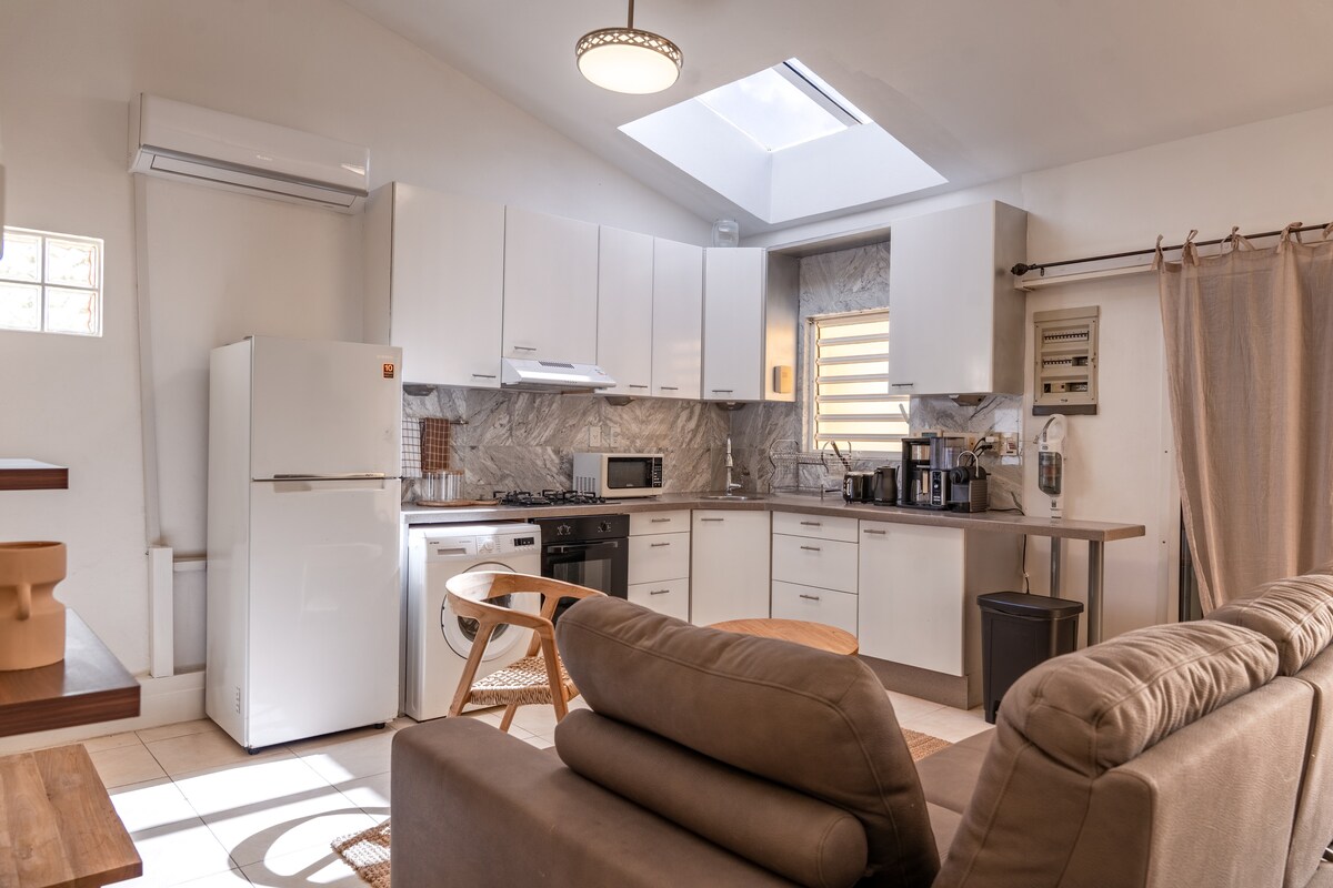 Moderne 1-værelses luksuslejlighed, der er adskilt fra hovedhuset. Backup-strømgenerator. Marmorgulve overalt. Alle apparater i rustfrit stål i et køkken i fuld størrelse. Gratis Wi-Fi inde og på tagterrassen. Satellit-tv. Ekstra Queen sofa soveplads i stuen til 2 personer. Vaskemaskine/tørretumbler. 90 trin til den smukke Simpson Bay Beach. Privat tagterrasse med 360° udsigt. Grill, køleskab og vask på tagterrassen. Strandstole, strandhåndklæder, parasol, kølere. Parkering lige uden for din port. Massage på stedet tilgængelig
