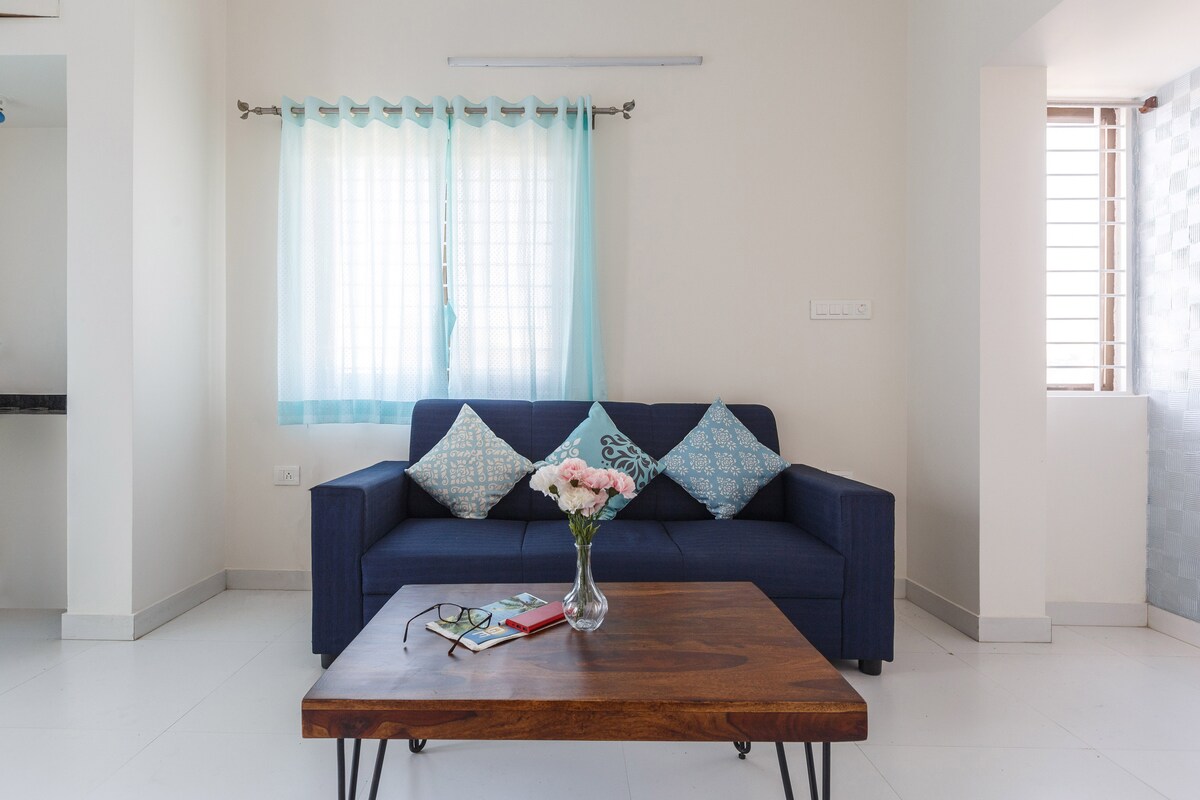 Velkommen til vores moderne, hyggelige studiolejlighed beliggende i et fredfyldt beboelsesområde i Bangalore. Nyd roen i dette rolige tilflugtssted, der er udstyret med aircondition i al slags vejr. Stream problemfrit med op til 100 MBps WiFi, og parker nemt din cykel uden problemer. Nyd gratis te og kaffe, mens du slapper af på førsteklasses madrasser klædt i kvalitetssengetøj. Vi dækker dig med shampoo og sæbe til et problemfrit ophold. Oplev komfort og bekvemmelighed, når det er bedst!