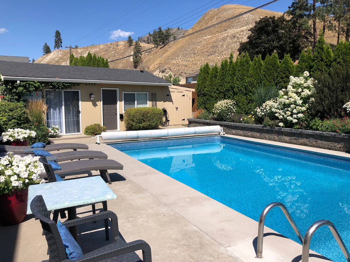 Dette selvstændige, moderne, renoverede 'poolhus' er en byinspiceret, licenseret (#00112755) suite, der tilbyder en privat beliggenhed, smuk landskabspleje, herunder et ægte palmetræ,🌴 pool og mange siddeområder til at nyde ejendommen. Beliggende få skridt fra Skaha Lake, under Skaha Bluffs Provincial Park og i gåafstand til Painted Rock Winery. Nyd vores kajakker og SUP'er samt et skur til at låse dine cykler/udstyr. Her er din mulighed for at nyde Okanagan-livsstilen og alt, hvad den kan tilbyde.