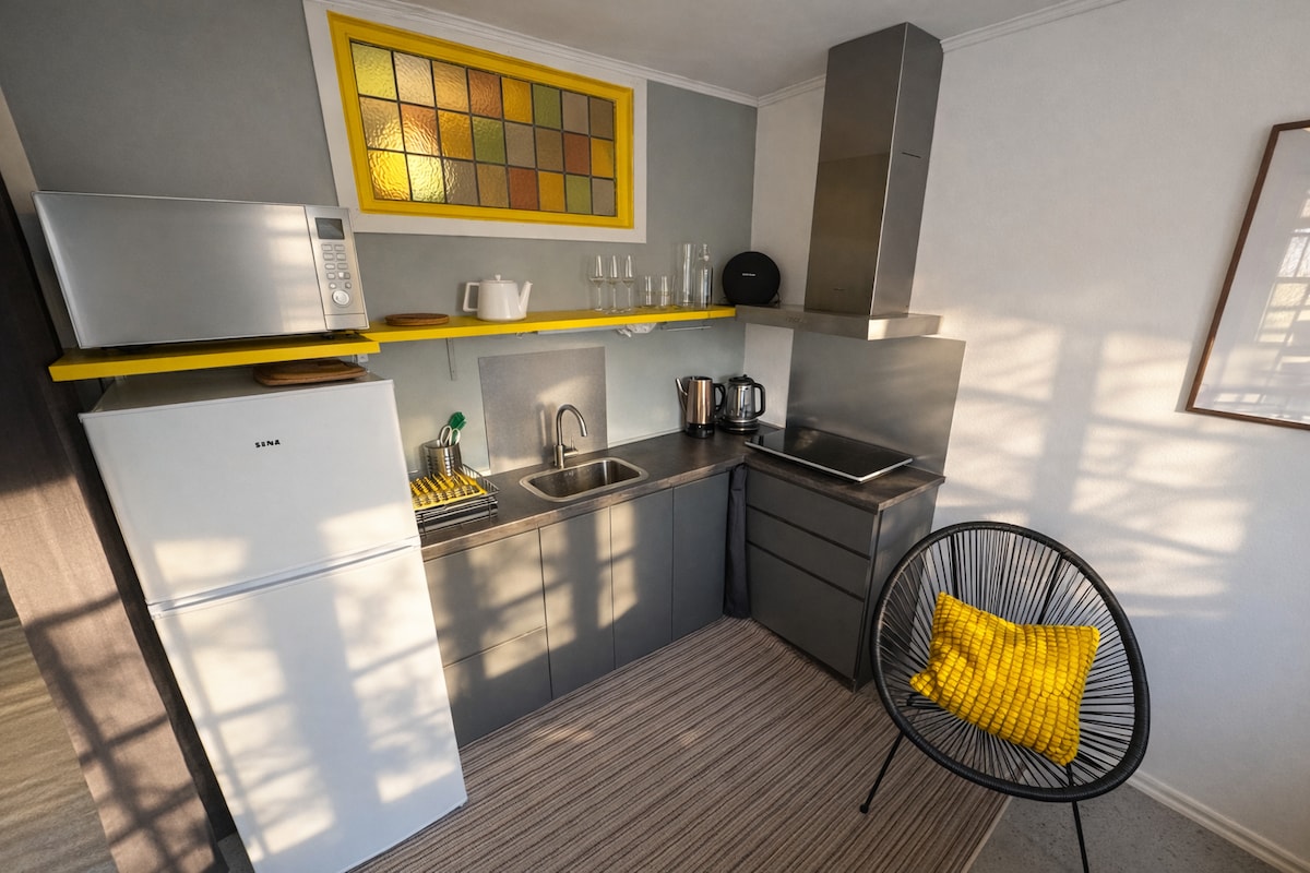 Velkommen, Mit navn er Frans, for et par år siden fik jeg et slagtilfælde, så min tale er ikke 100 %, men jeg forstår hollandsk, engelsk og svensk. Stuen, soveværelset og badeværelset er bygget inde i en garage, som også er din (der er masser af varme). Der er blevet installeret et lille køkken, der har komfur, brødrister, kedel, køleskab, mikrobølgeovn og selvfølgelig dine grundlæggende faciliteter.(Der er også en crockpot). Hvis du har brug for andet køkkenudstyr, skal du bare spørge :)