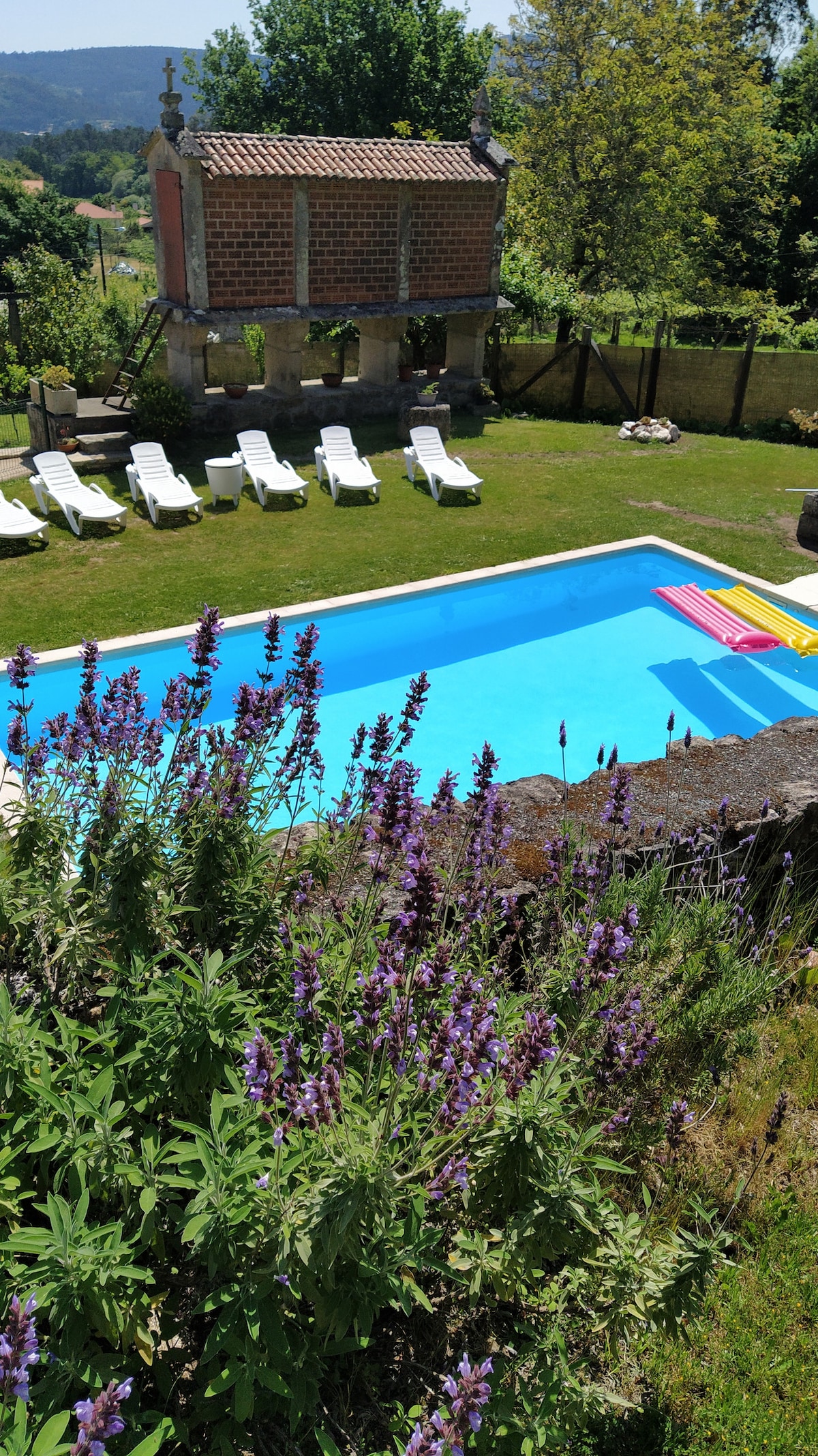 Vi har otte sengepladser, tre soveværelser, stue med pejs, køkken og tre badeværelser, samt en smuk gårdhave, veranda og 2000 m lukket og indhegnet grund til kæledyr, grill og en smuk swimmingpool. Vores hyggelige hus ligger 15 km fra Santiago, midt på Camino de la Plata, 300 meter fra det sidste vandrerhjem. Vi er placeret på Pico Sacro, hvorfra man kan se hele regionen. Det er et ideelt sted, hvor du kan nyde naturen og roen, og det er en perfekt beliggenhed, hvis du vil tage på udflugter.