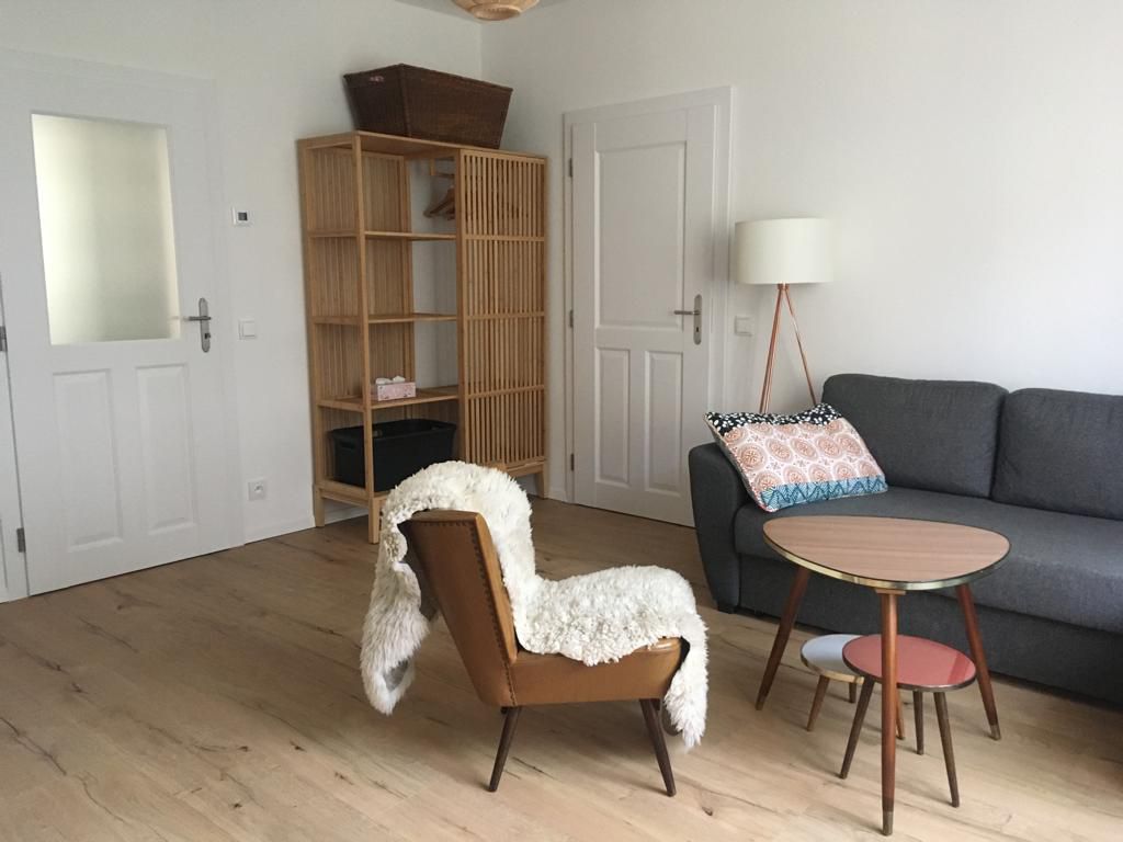 Sunny attic apartment in a quiet part of the city near the center and the forest. The bedroom offers a double bed with a size of 2x2m. There is a sofa in the living room, which can be expanded to a size of 190x150 cm and allows two more people to sleep. In the living room there is a kitchen with stove, sink, refrigerator, dishes. The apartment has wifi and two televisions. The bathroom has a small wooden sauna for max. 2 people. The toilet is separate. You are in the center in 5 minutes on foot.