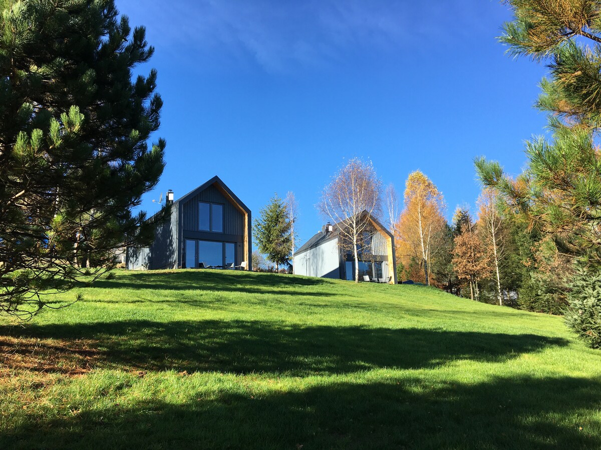 HUSENE med 3-SQUARE-FOOT er to skandinaviske huse, der ligger i udkanten af landsbyen Krivi. URSAS huse ligger på en indhegnet eng ved foden af Little Brightness nær den røde sti. Huse helt bygget af træ og elektrisk opvarmet. Ideel til 6 personer. Arealet af hvert af husene er 80m2. 3 DIMENSIONER er et glimrende udgangspunkt i High Bieszczady samt i Solina området.