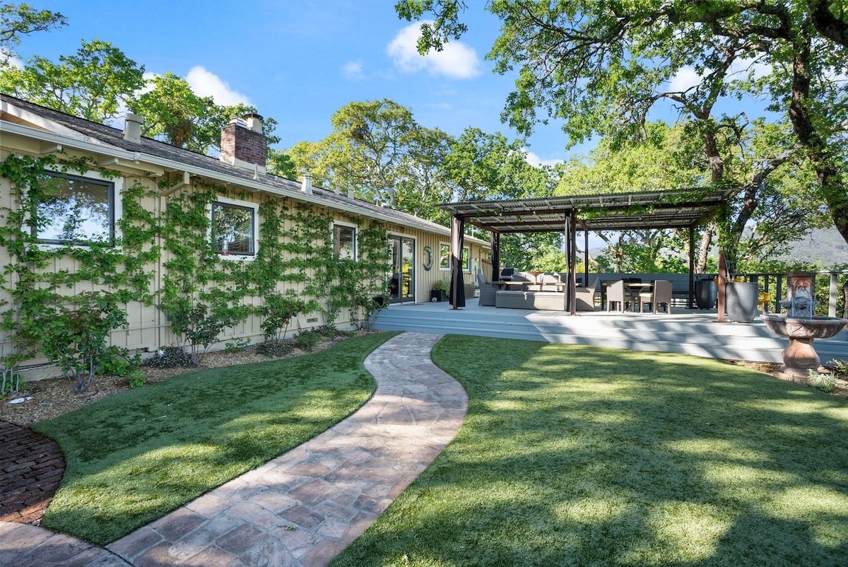 Central beliggenhed i vinområdet Tæt på vingårde, smagerum, gourmetmarked, fransk bageri og restauranter Ny luksus 3-BR, 2,5 badeværelse Boblebad og boccia Vi kan være vært for 5 voksne + 2-3 børn Stille rummelig bolig beliggende i redwoods på 1/2 acre Gratis kager fra det lokale bageri Sengetøj, håndklæder, spa-kåber og toiletartikler Gratis kaffe, te og sukker Kæmpe udendørs terrasser med 3 siddeområder, spisebord, bålplads Corn-hole, kæmpe jenga og brætspil Børnebøger, spil og babyartikler