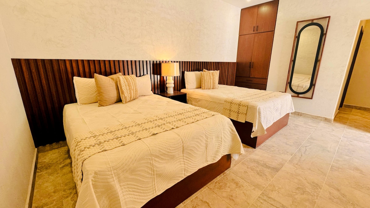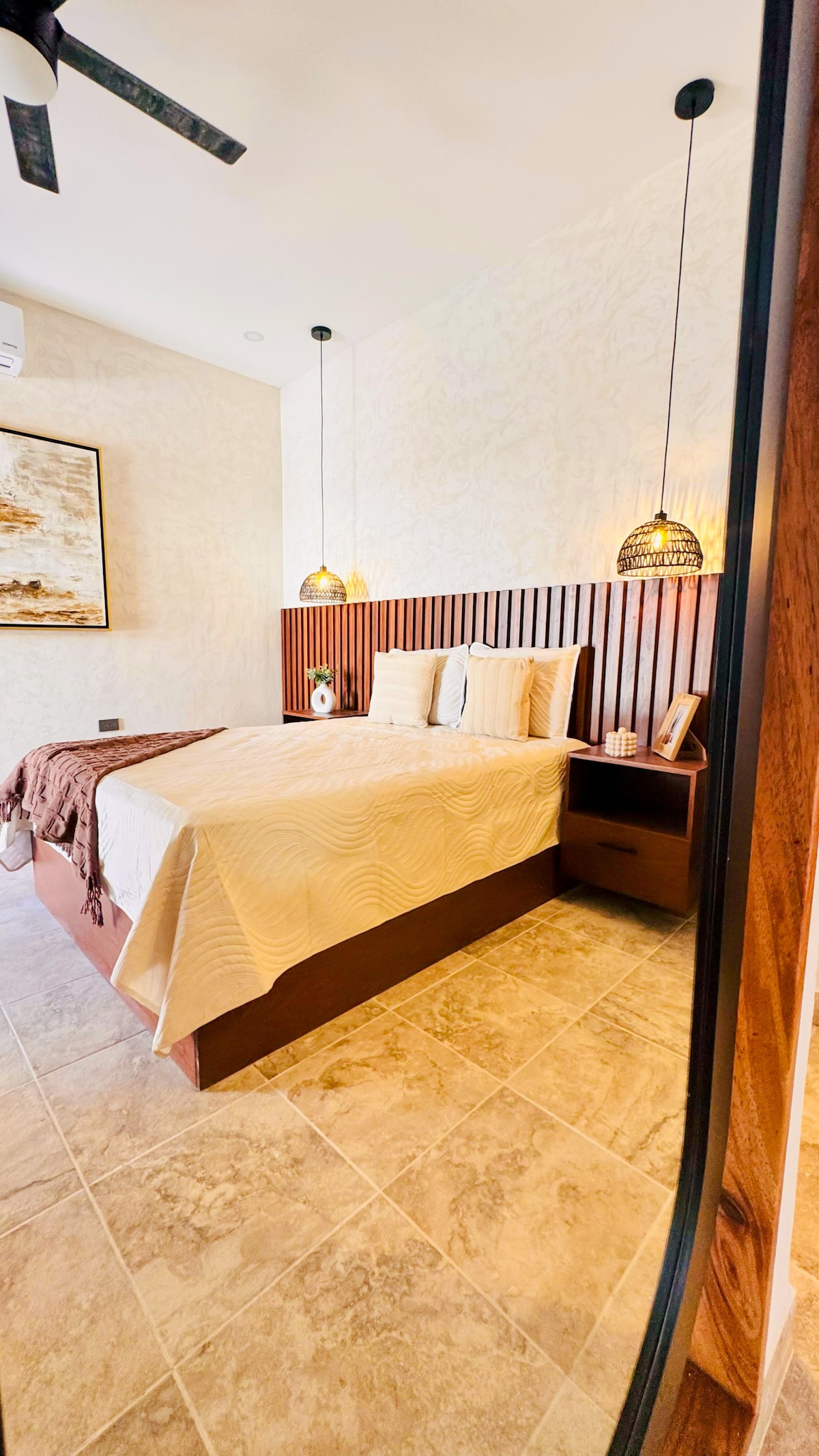 Et moderne værelse med indretning, der får dig til at føle, at du har taget stranden med tilbage. Dette værelse ligger i hjørnet for at være dit perfekte hjem væk hjemmefra. Hvis der er flere faciliteter såsom aircondition, minikøler, fjernsyn, wi-fi og privat bruser, der er adskilt fra forfængelighed, mens du gør dig klar. Du er sikker på at nyde dit ophold i dette elegante, men hyggelige værelse.