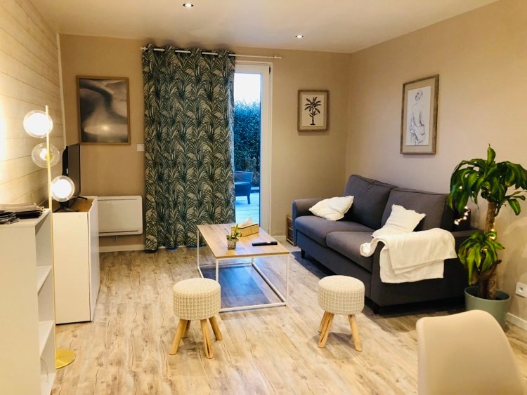 logement 45 M² comprenant une chambre ,cuisine équipée, une pièce de vie avec canapé lit,salle de douche avec WC. La capacité d’accueil est de 4 couchages. Le logement refait à neuf est situé au sein d’un manoir du 16 et 17 ° siècle, dans un lotissement privé, au calme, avec vue sur un parc boisé. Quartier des 2 LIONS de TOURS, vous serez à 15mn en tramway du centre de Tours (arrêt du tramway à 300 mètres). Espace extérieur avec table et chaises pour profiter de la douceur tourangelle