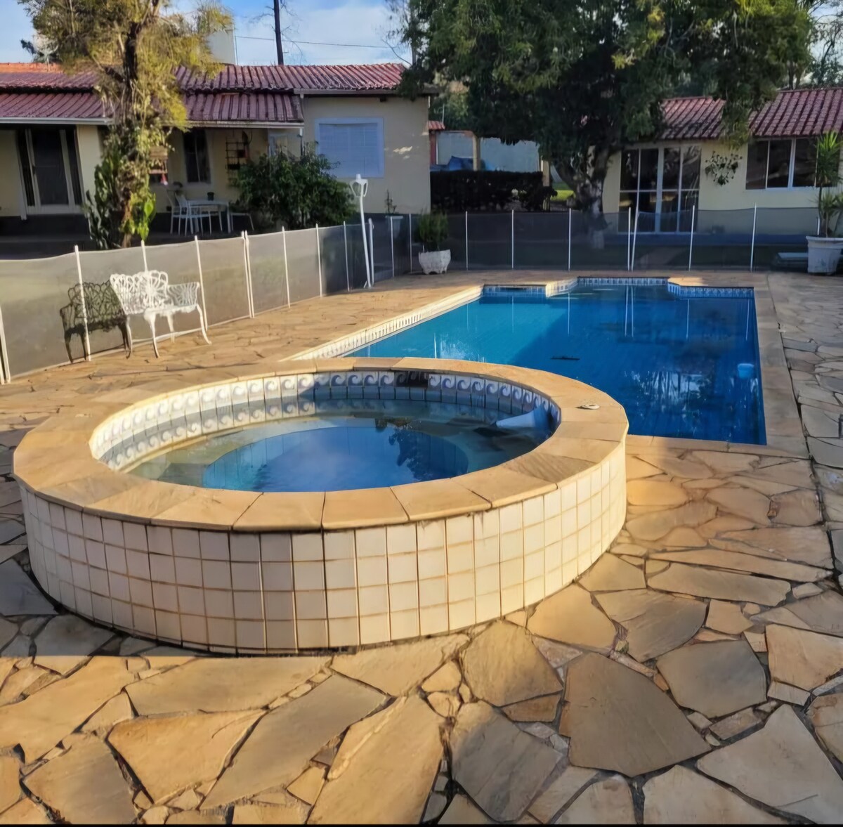 Mínimo 6 pessoas • Quartos com camas e ar-condicionado • Sala com sofá e TV • Banheiros com 2 chuveiros • Área externa com churrasqueira, fogão, mesa e geladeira • Deck com sofá, TV e vista para a piscina Inclui: Café da manhã, almoço, roupa de cama, piscina, pesqueiro, playground, fazendinha e estacionamento gratuito.