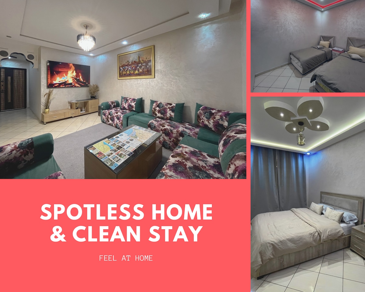 Velkommen til vores hyggelige lejlighed i en sikker, lukket bolig med parkering og legeområde for børn. Den ligger på 3. sal (ingen elevator) og tilbyder et lyst og fredeligt rum med en smuk udsigt over et torv, der er perfekt til afslapning eller træning. Ideel til familier, turister og forretningsrejsende, der søger komfort, sikkerhed og nem adgang til nærliggende butikker og tjenester. 3,2 km fra Souk Alhad, 5,9 fra stranden, 5,8 km fra Adrar Stadium og få skridt fra universiteterne (ca. 800 meter)