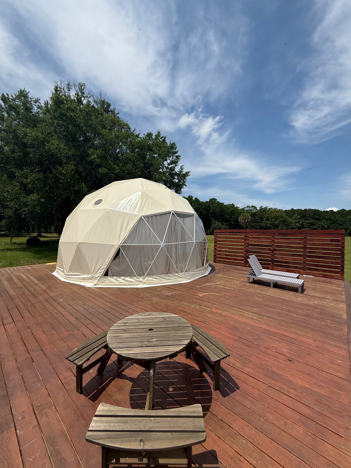 Glamping: hvor luksus møder udendørslivet. Denne geodetiske struktur giver en sjælden mulighed for at opleve udendørslivet uden elementerne. Komplet med køkken, aircondition og varme, dobbelt opvarmet madras, fuldt fungerende badeværelse og udsigt til solopgangen over græsset. Uanset om du er ude efter at slappe af og nyde at fodre husdyrene, tage på eventyr i svævebanen eller nyde en romantisk aften med at drikke vin i boblebadet under stjernerne, vil du gå derfra med varige minder.