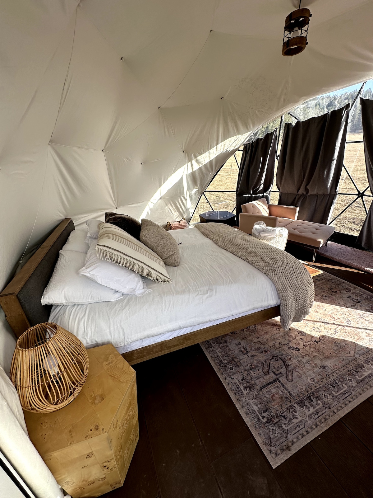 Glamp in comfort! Queen bed, coffee bar, and relaxation chairs. Relax on your private outdoor space with twinkle lights, gas & wood fire pits (wood for sale). Clean shared restrooms a short stroll—no bathroom in unit. Portable AC in summer & heater in winter. Dog-friendly for sweet pups. No WiFi—this is an unplugged, stargazing getaway! Easy self check-in with directions sent before arrival.