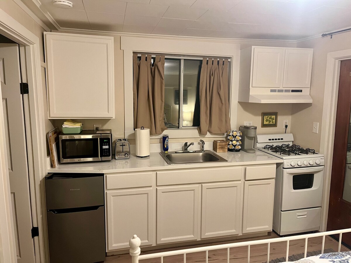 Studio is conveniently located downtown Puyallup, above garage. Air conditioned unit includes a full kitchen(stove, refrigerator, and dishwasher) with single serve coffee maker, private bathroom with slate tile flooring, and a small utility closet with a washer and dryer. 32" TV, Blue-Ray/DVD player, WiFi, and bedside table lamps with USB ports. Leather power reclining loveseat with powered head rest that also has usb ports on the side. Very close to bus route, and the Washington State Fair.