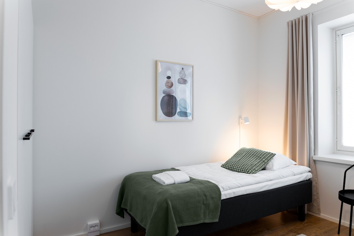Lejlighed med to soveværelser til fire gæster bygget i 2018 nær Turku centrum. Lejligheden er veludstyret med dine daglige apparater såsom køleskab, komfur, mikrobølgeovn, vaskemaskine, opvaskemaskine, kaffemaskine og forskellige køkkenredskaber og redskaber. De nærmeste dagligvarebutikker og restauranter ligger kun 7 minutters gang væk. Hvis du vil have flere valgmuligheder, ligger byens torv kun 3 minutters buskørsel fra stoppestedet i nærheden. Sengetøj er inkluderet i dit besøg. Tag det roligt.