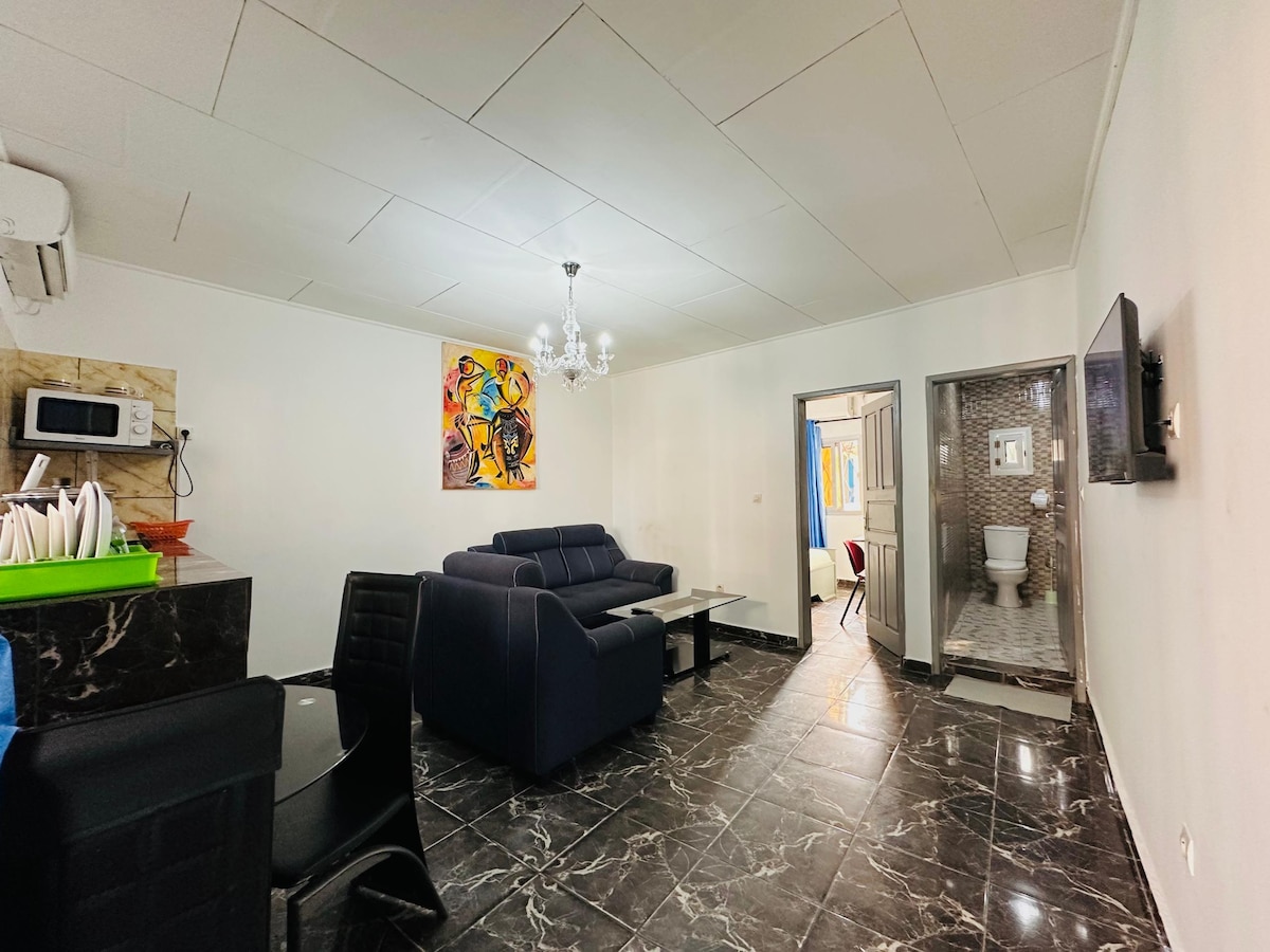 Møbleret lejlighed med to soveværelser beliggende i Makepe, Douala, ved siden af vejen. Fuldt udstyret, ideel til kurser og lange ophold. Udstyret med to balkoner, ubegrænset højhastighedsinternet (optisk fiber), Canal Sat, et Smart TV med Netflix, Amazon Prime og YouTube integreret, sikkerhed 24/7, overvågningskameraer i bygningen, gratis parkering, varmt vand, vaskemaskine, udstyret køkken, aircondition i alle rum, to ventilatorer, generator.