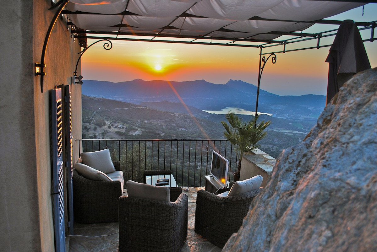 Med havudsigt, den typiske lejlighed PANURAMICU (betyder Panoramisk) er til leje i Sant'Antonino, den ældste korsikanske landsby, i hjertet af Balagne, klassificeret som en af de smukkeste landsbyer i Frankrig. Den ligger 500 meter over havets overflade på en granitklippe mellem hav og bjerge, tæt på Calvi og Ile Rousse. Man kan kun bevæge sig rundt til fods gennem smalle brostensbelagte gader og et netværk af buede gallerier.