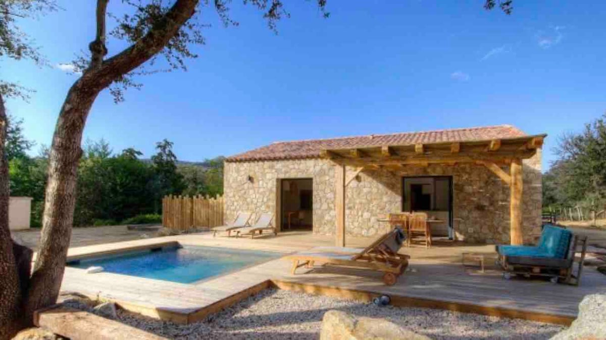 Korsikansk stenhus mellem hav, bjerg og pool.