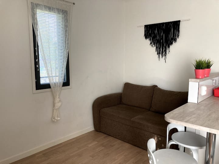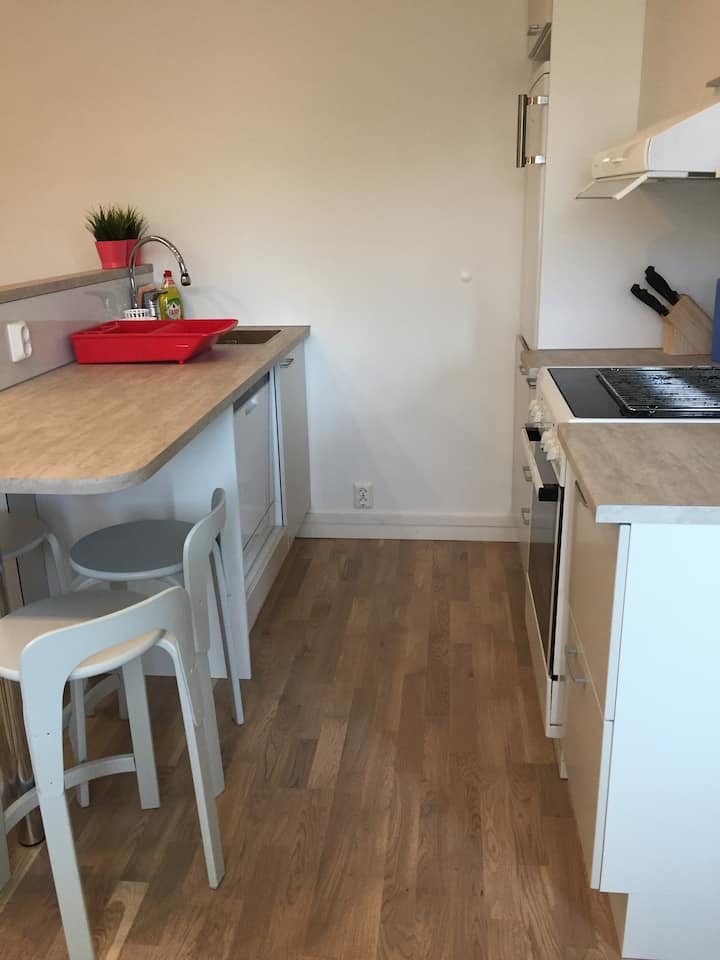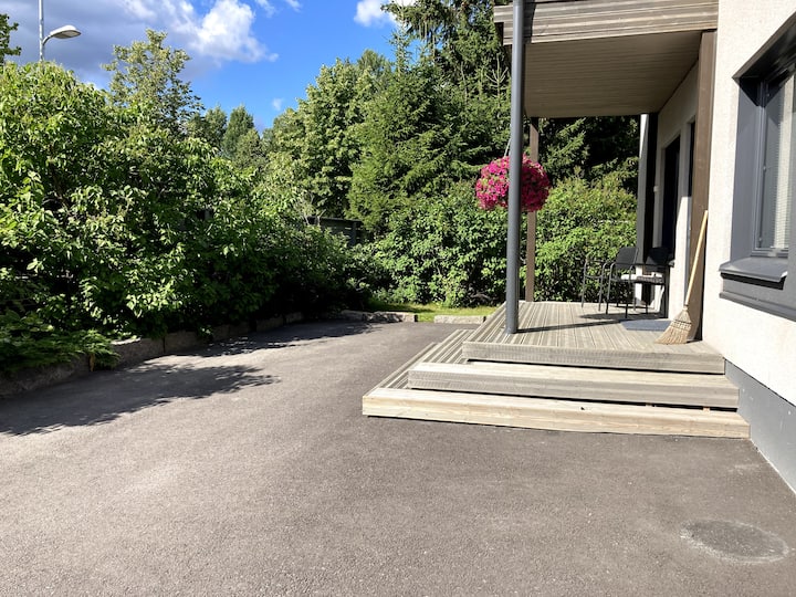 Dobbeltværelse for enden af det nye fritliggende hus, køkken-stue med sovesofa (140 cm), soveværelse med dobbeltseng (160 cm), badeværelse med brusekabine, terrasse og parkeringsplads foran lejligheden. Til togstationen og rejsecentret 1,3 km, til centrum 1 km, til havnen mindre end 2 km.