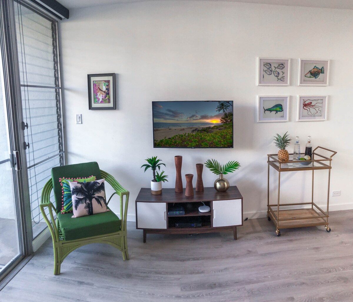 Denne dejlige, nyligt opdaterede lejlighed på Mauis smukke North Shore ligger på Kuau Plaza i Paia. Hvis du leder efter en fantastisk beliggenhed, få skridt fra stranden og vil opleve det ægte Maui, behøver du ikke lede længere. Denne lejlighed på første sal har en stor græsplæne med direkte sti til stranden. Den opdaterede indretning er moderne fra midten af århundredet med tropiske detaljer for at ære bygningens historie, som minder om det gamle Hawaii.