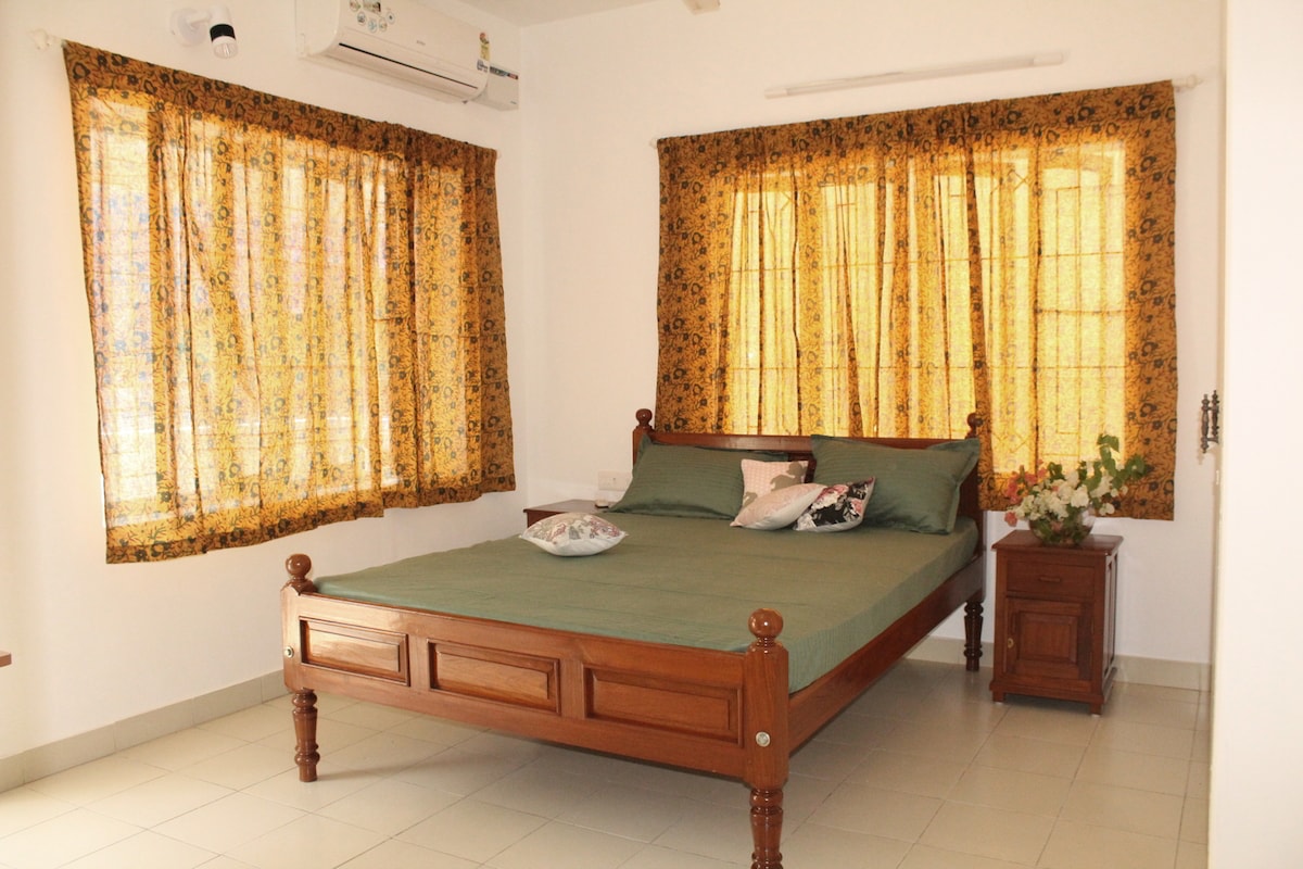 Denne 1-værelses lejlighed i stueetagen med en gang, funktionelt køkken og tilstødende badeværelse er et helt privat område uden deling af noget område. Det er i gåafstand fra Promenade Beach, Rock Beach, Ashram, White Town, marked og gode caféer. Stedet ligger tæt på den hvide by og stadig tæt på naturen og meget fredfyldte omgivelser. Alle vinduerne vender ud mod en stor grøn grund. Det har fuldt funktionelt køkken med redskaber, fryser, aircondition, varmt vand, tv, højhastigheds wi-fi. Vi skal bruge id-beviser for alle gæster.