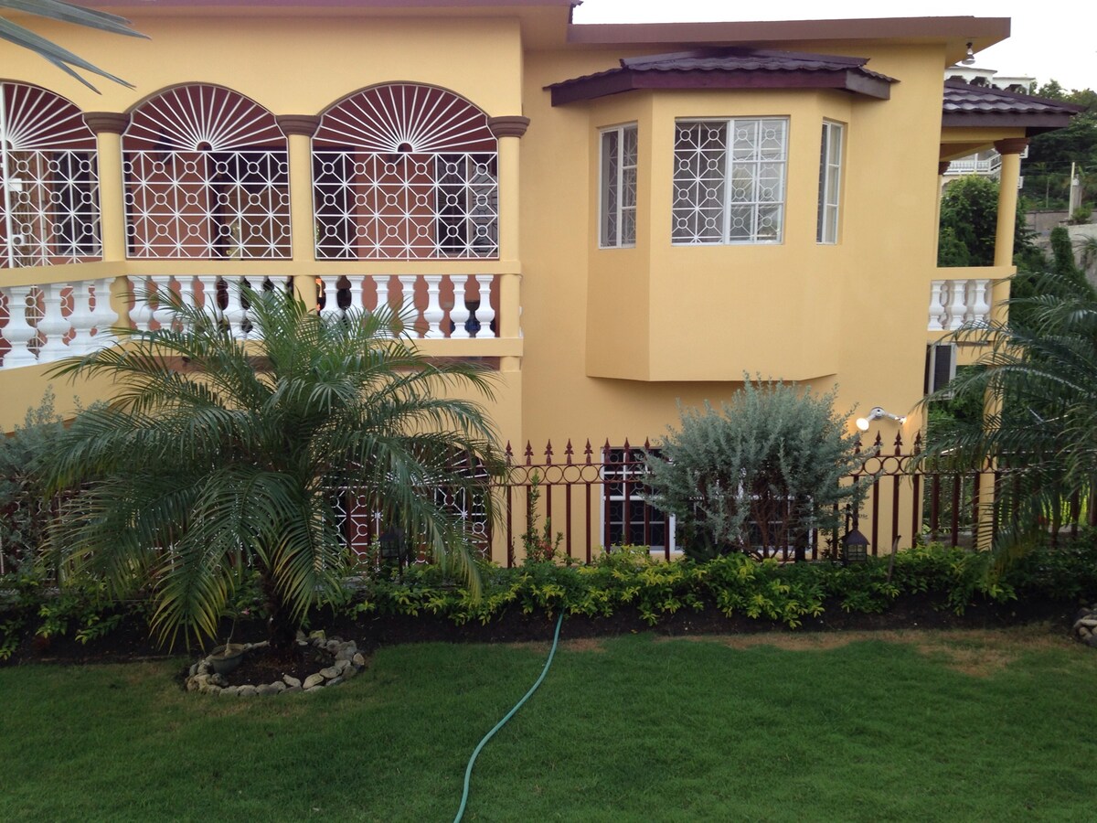 Sikkert venligt område. Lufthavnstur $ 30/1-2 + $ 10 pp. Veranda indgang, stue/spisestue, 2 soveværelser, 2 badeværelser; adgang til hængekøje, taglounge. I nærheden af dagligvarebutik, madlavningsbutikker, taxaer (1 USD pp/130 JMD) 10 min. til kulturmuseum i midtbyen og gratis Harmony Beach, bondemarked, bus. Derefter gå eller $ 1 taxa til butikker, dans, spisesteder, Dr Cave beach. Tips: JM&Rastafari kultur/historie, sundhed. Bonus 4-gebyr: Detox, rundvisninger, massage, hårfletning, måltider/madlavningstime, fysioterapi! Klik på værtsbillede 4 andre rms.