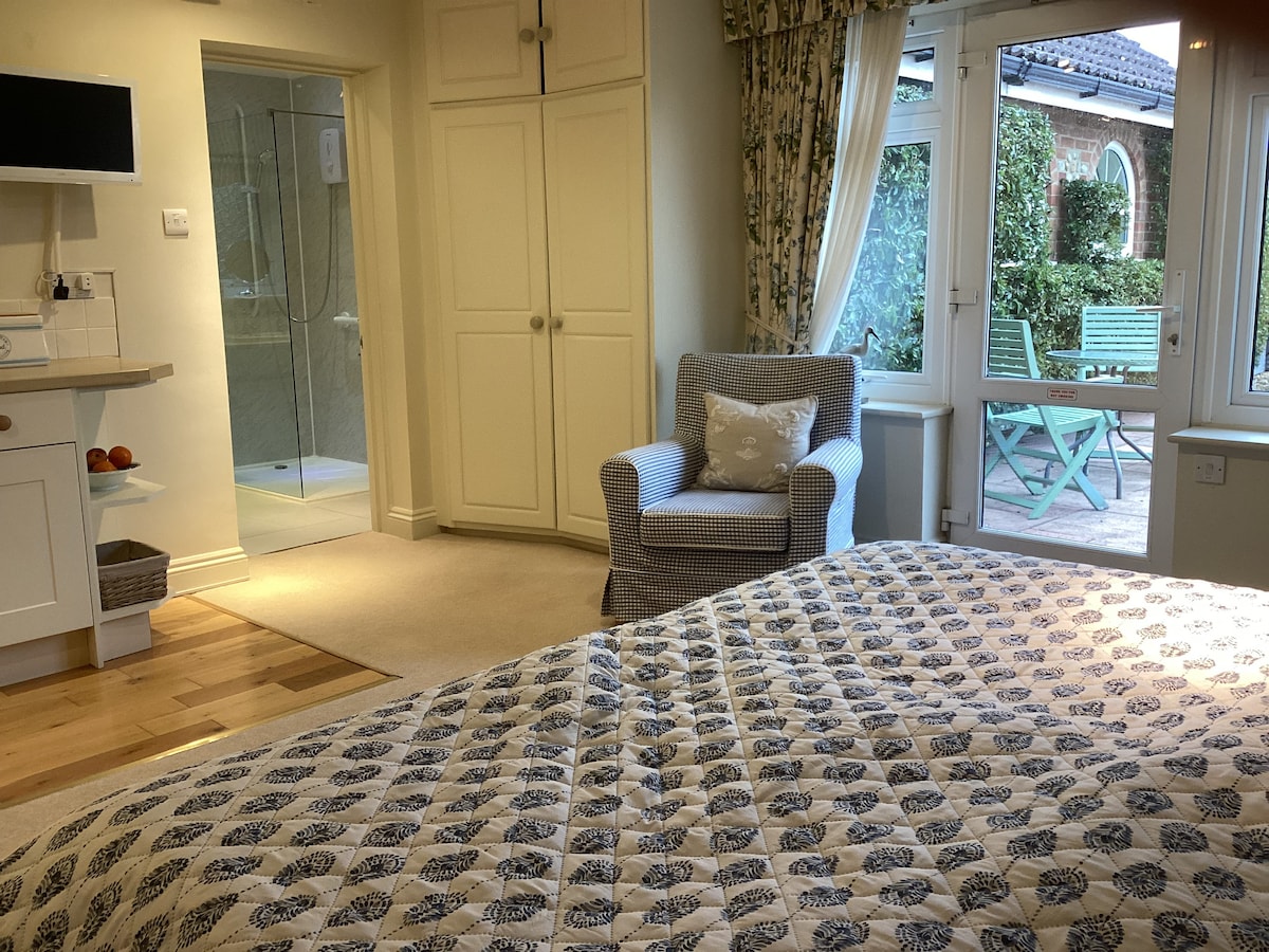 Selvstændig anneks med minimale madlavningsfaciliteter – i stueplan åbent tekøkken med mikrobølgeovn og kogeplade, opholdsområde (smart-tv), spiseområde. Ovenpå i soveværelset med kingsize-seng, (smart-tv) skråt loft - separat brusebad med toilet og håndvask. Andet soveværelse (anmod om booking) enkelt seng, skråtag. Udendørs toilet og køleskab, hvis det er nødvendigt. Velkomstpakke til din første morgenmad. Køkkenfaciliteter, der er velegnede til morgenmad og lette frokoster.