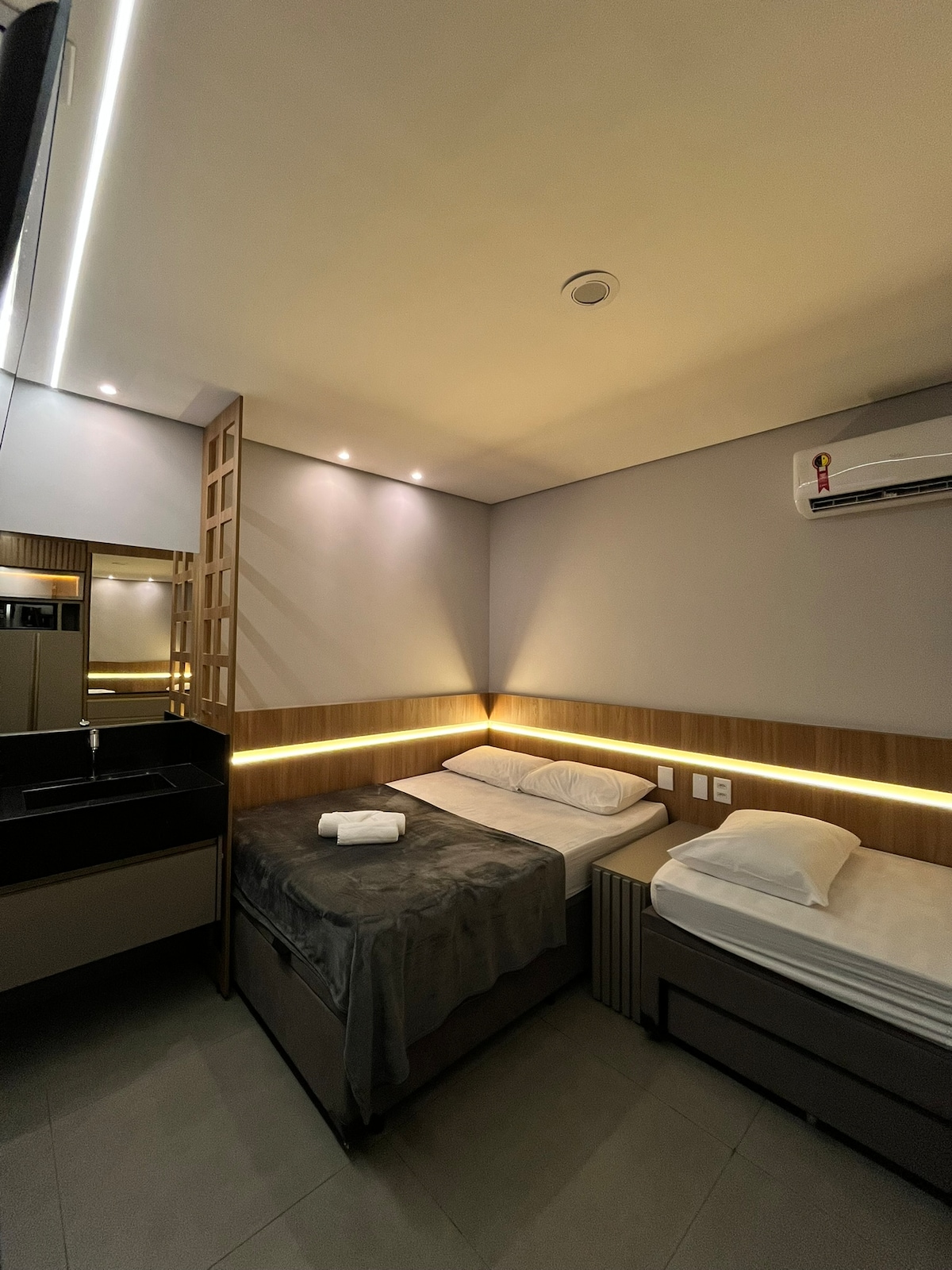 Loft alto padrão. Cama Queen hotelaria americana, colchão de molas ensacadas e látex. Cozinha completa para cozinhar c/ vários eletrodomésticos. Possui ar-condicionado Ótimo p/ trabalhar: escrivania, cadeira ergonômica, Wi-Fi alta velocidade (400 Mb). Disponibilizo toalhas e roupa de cama. Necessário enviar documento de identificação dos hóspedes, que só são autorizados a entrar no condomínio com esses dados do documento.
