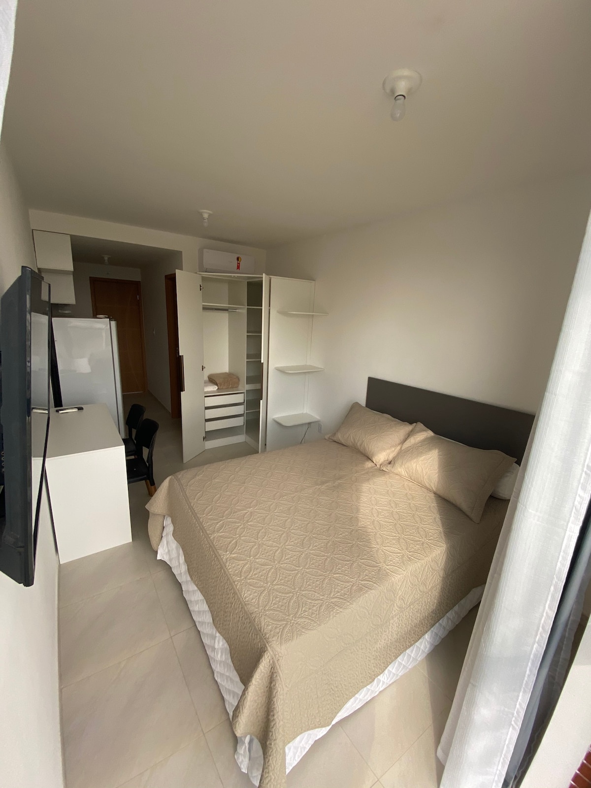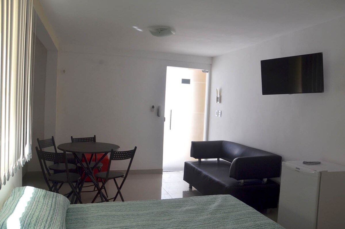 Studio i Boa Viagem med en smuk havudsigt, hyggelig og godt beliggende: 🏖️12 minutters gang til det bedste område af Boa Viagem-stranden; ✈️ 15 minutter fra lufthavnen; 🛍️ 8 minutter fra Shopping Recife; 📍 Tæt på markedet, bageri, restauranter og barer. Ved siden af Via Mangue, som er en af de vigtigste adgangsveje til den nordlige zone, Recife Antigo og Olinda. Bygningen har en døgnåben indgang, et minimarked, et smart vaskerum og en tagterrasse med en smuk udsigt. Vi tilbyder en garage.